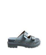 Les deux larges brides sont dotées de boucles argentées réglables, offrant un ajustement personnalisé à votre pied. Sur les côtés, une rangée de rivets métalliques renforce le design avec caractère et modernité. Chaque détail a été pensé pour allier esthétique et fonctionnalité.