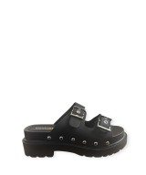 Les deux larges brides sont dotées de boucles argentées réglables, offrant un ajustement personnalisé à votre pied. Sur les côtés, une rangée de rivets métalliques renforce le design avec caractère et modernité. Chaque détail a été pensé pour allier esthétique et fonctionnalité.