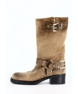 Réalisée en cuir suédé patiné couleur taupe, NYA affiche une allure brute, adoucie par des finitions soignées. Ses brides ajustables, ornées de boucles métalliques argentées, structurent la silhouette de la botte tout en renforçant son caractère. La bague latérale apporte une touche rock sans concession.
