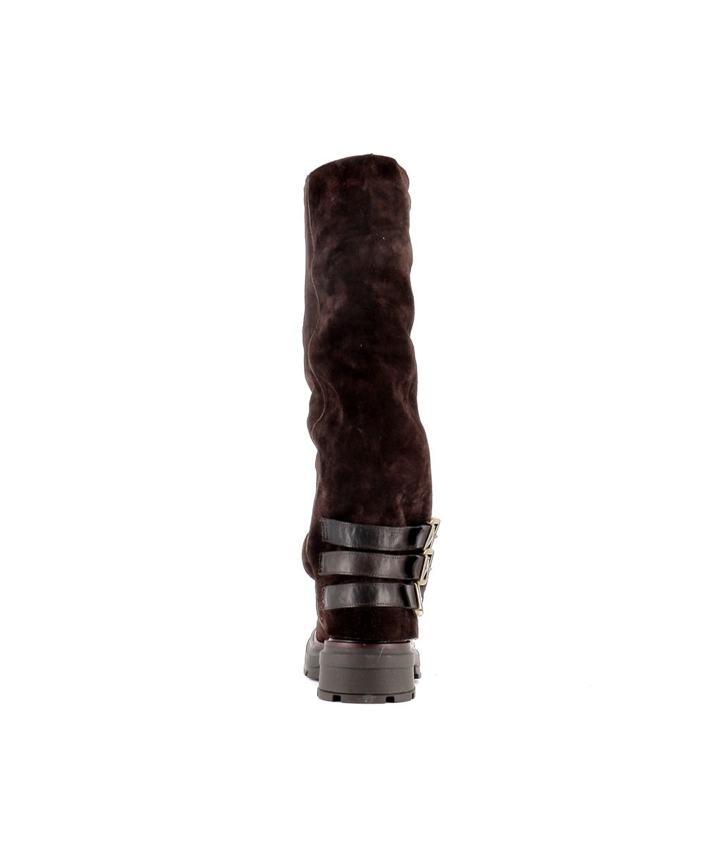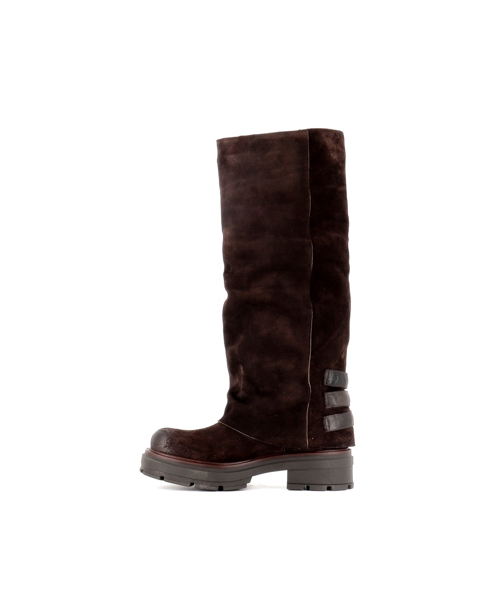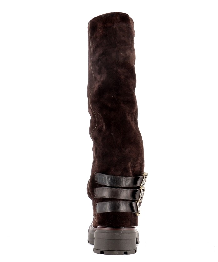 La semelle crantée marron foncé, robuste et adhérente, repose sur un talon bas stable et confortable. Le plissé naturel de la tige donne un tombé souple très flatteur sur la jambe, idéal pour un porter avec un jean rentré ou une robe mi-longue.