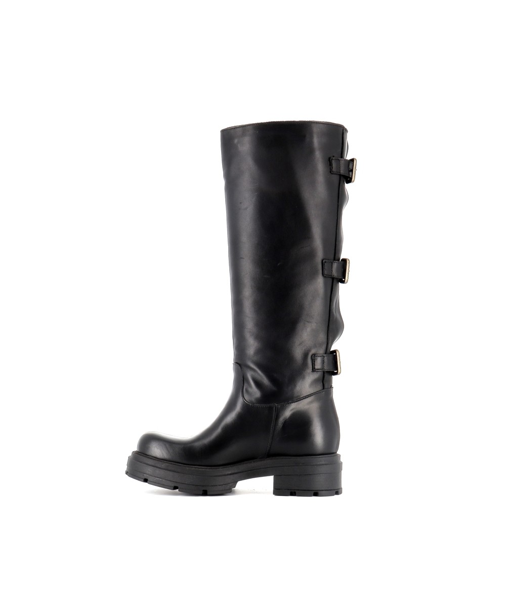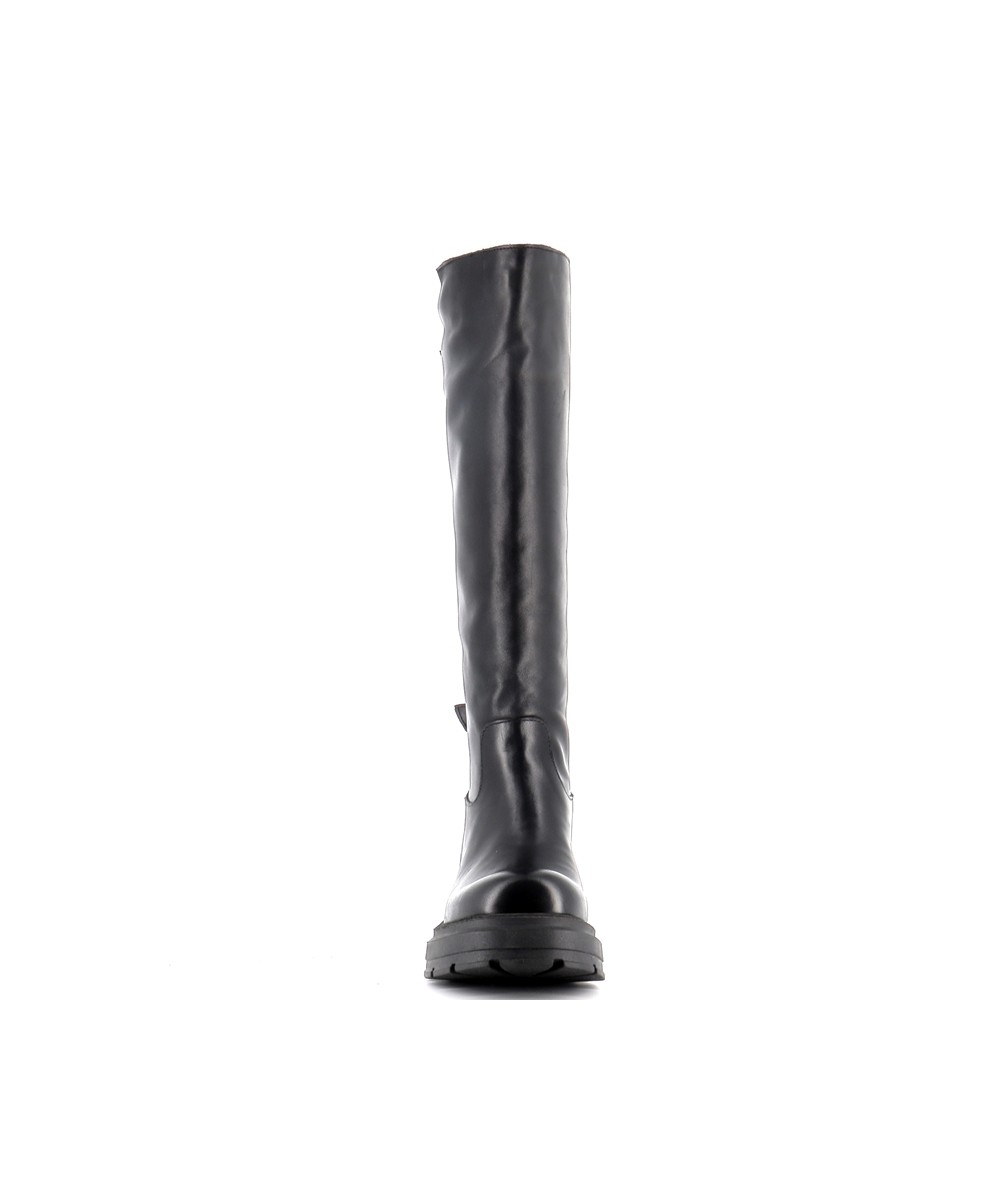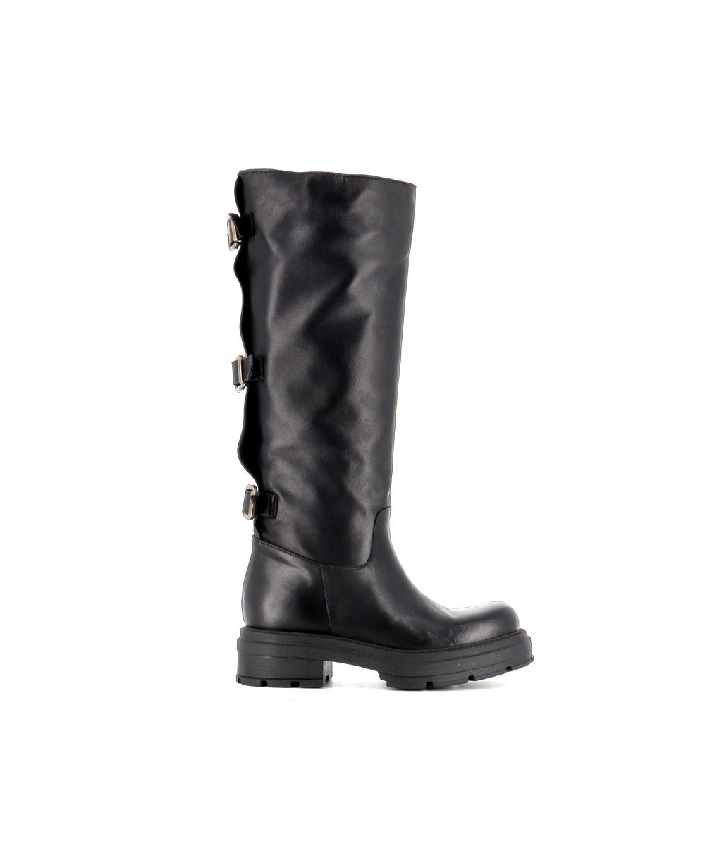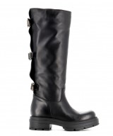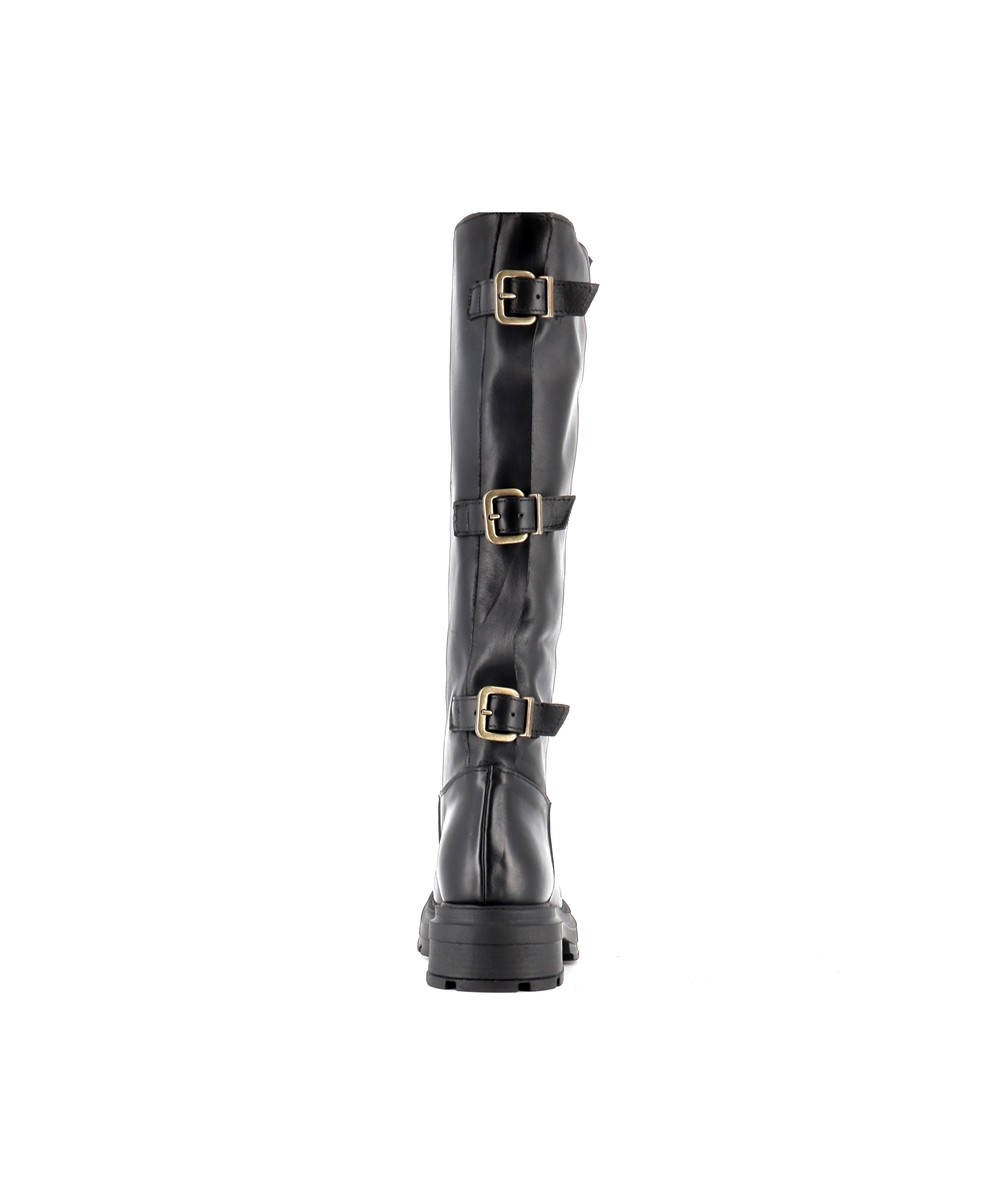Le cuir noir utilisé est souple mais structuré, permettant un porté confortable tout au long de la journée. La botte s’ajuste facilement à différents tours de mollets grâce à ses brides, tout en restant facile à enfiler.