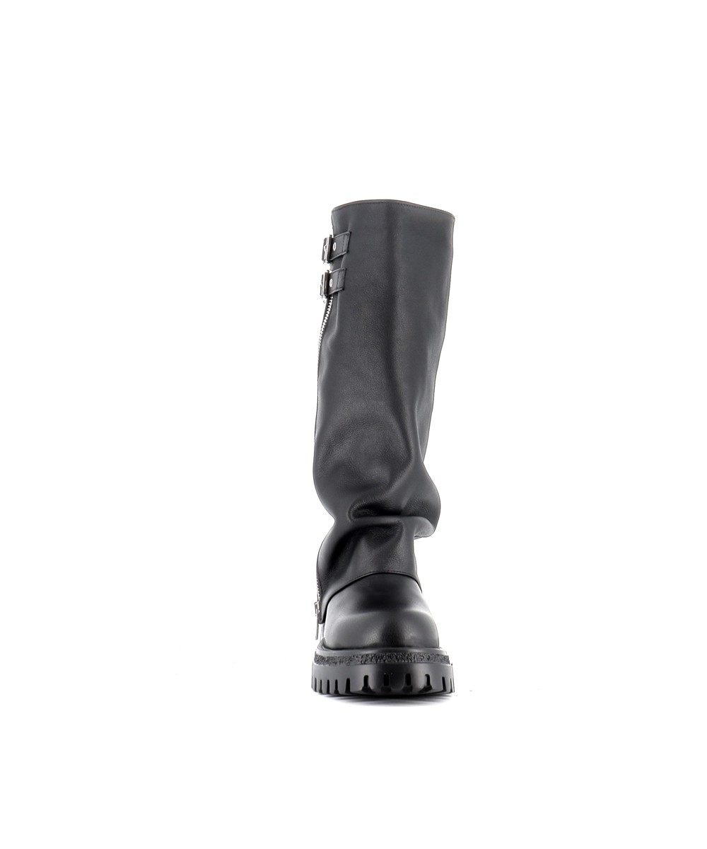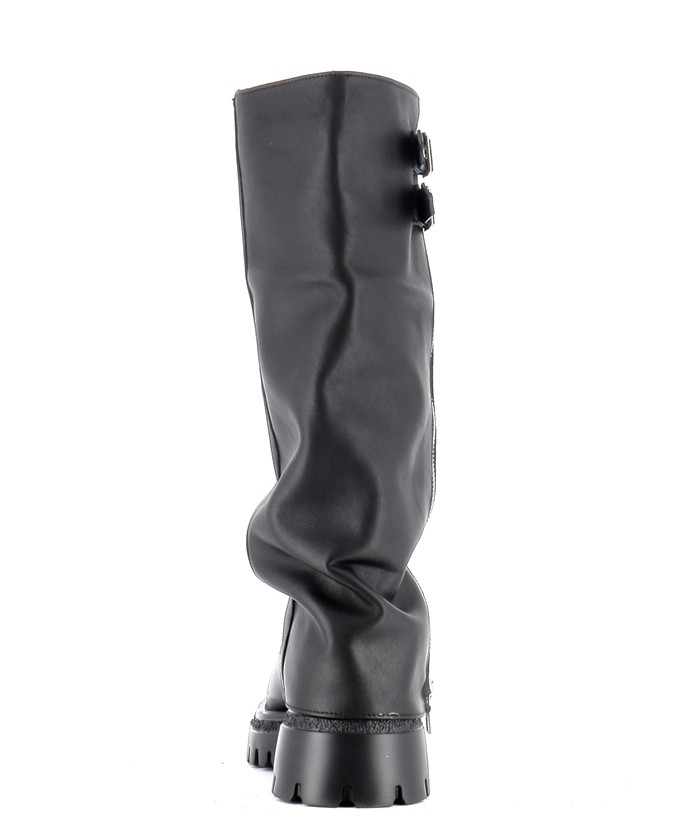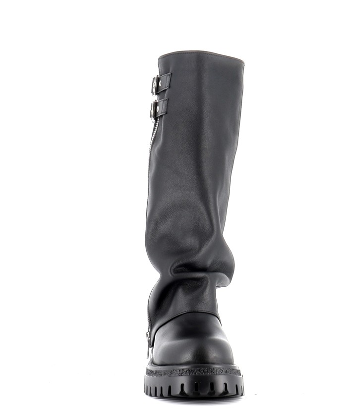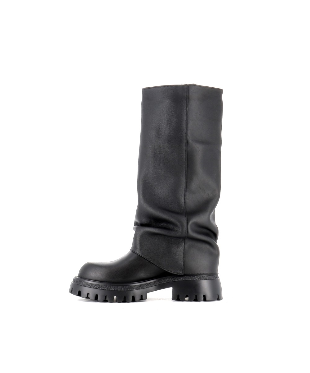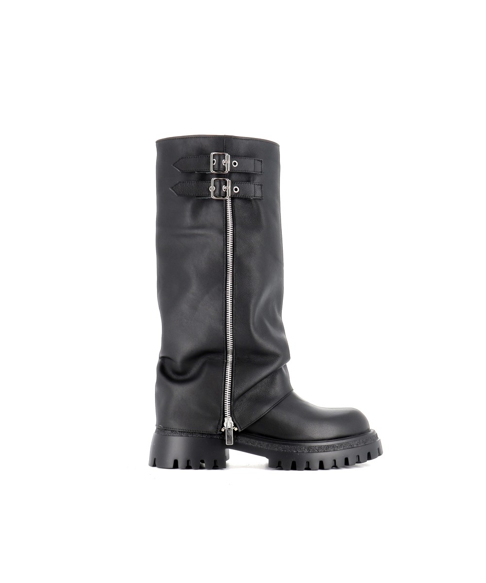 Les deux boucles argentées, situées sur le haut de la tige, sont ajustables et décoratives : elles apportent un jeu de contraste avec la sobriété du cuir noir et accentuent l’allure graphique de la botte. Chaque détail a été pensé pour allier esthétisme et fonctionnalité : la fermeture intérieure permet un enfilage rapide et confortable, tandis que la doublure intérieure offre chaleur et douceur au porté.