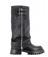 Ce modèle monté sur une semelle crantée de caractère conjugue à la perfection robustesse et féminité. Sa tige haute, conçue dans un cuir noir souple et légèrement grainé, épouse naturellement la jambe tout en apportant structure et maintien. Le zip métallique visible, placé sur le côté extérieur, confère à la botte un esprit utilitaire chic, à la croisée du look biker et de la tendance citadine.