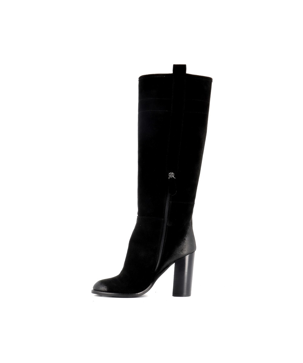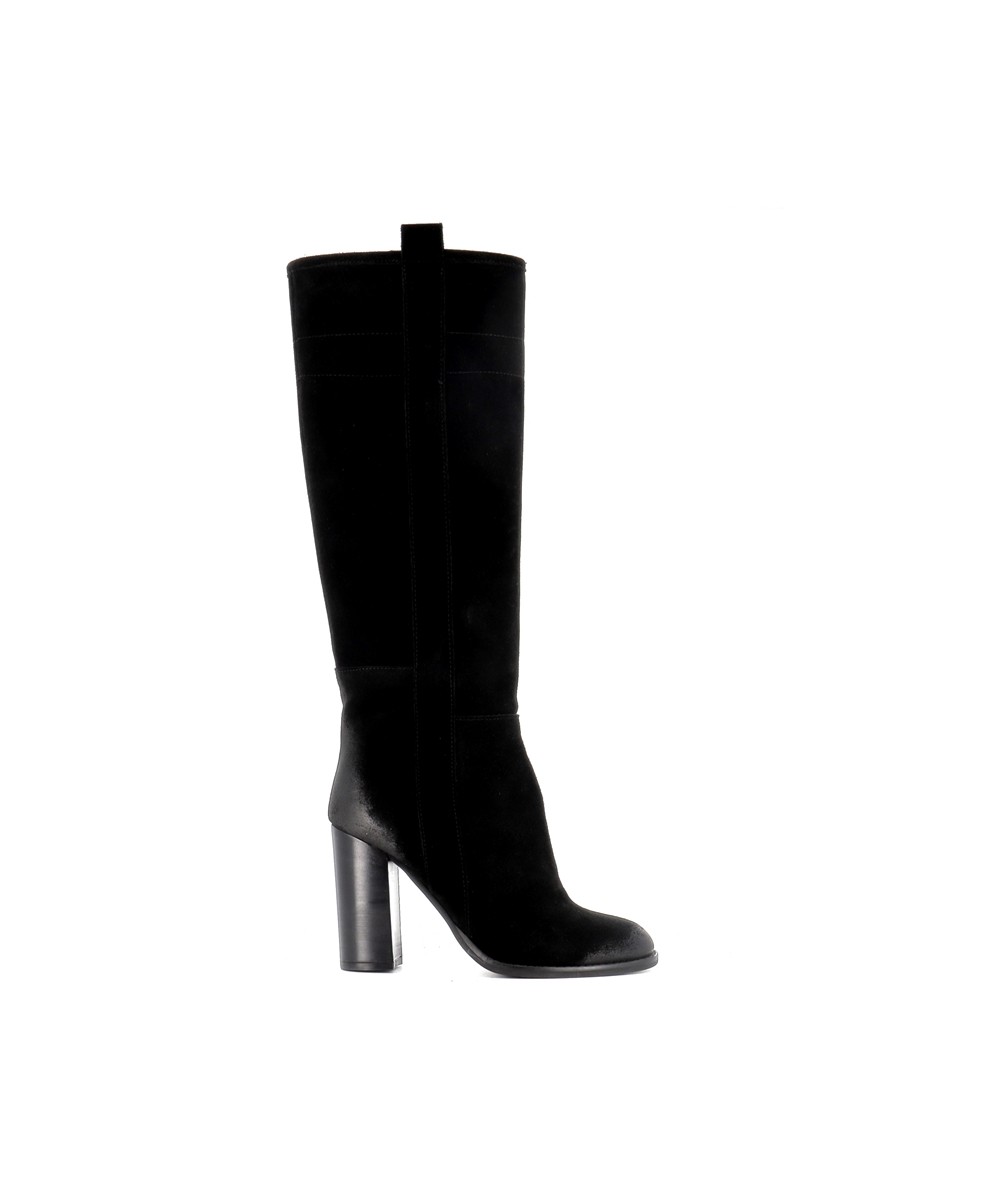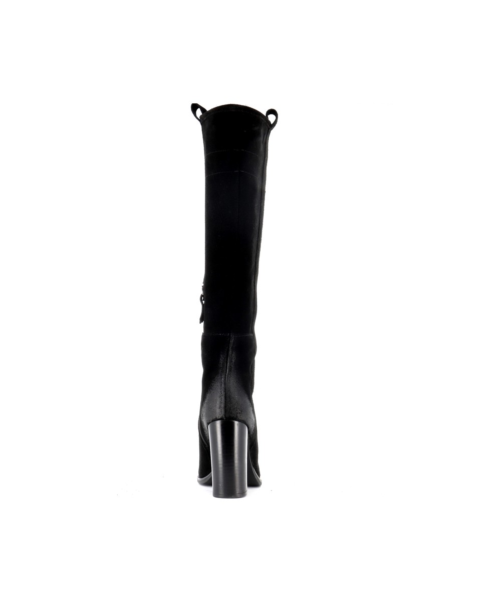 Son design minimaliste est mis en valeur par un daim noir profond et velouté, offrant un rendu noble et raffiné. Sa tige montante structurée épouse harmonieusement la jambe et élance la silhouette. Le talon cylindrique de 10 cm ajoute une touche sophistiquée sans compromettre la stabilité à la marche.