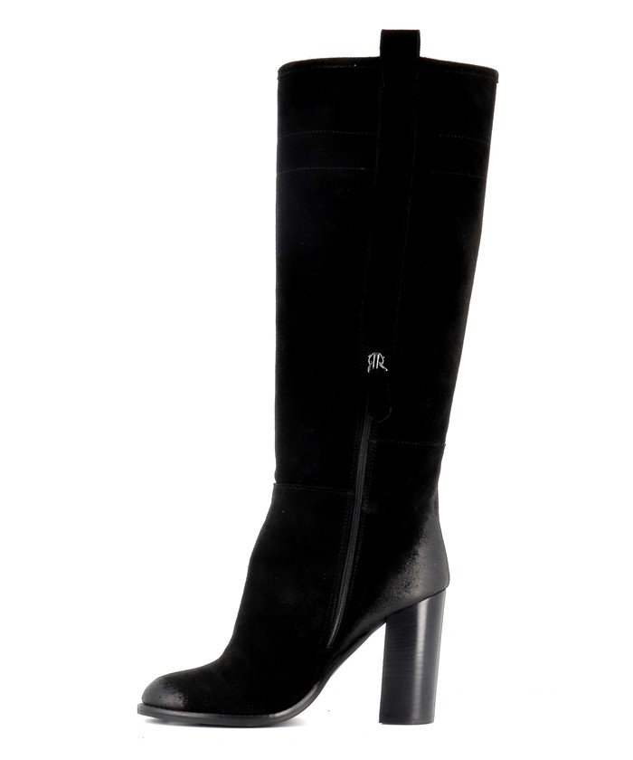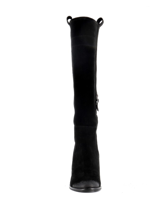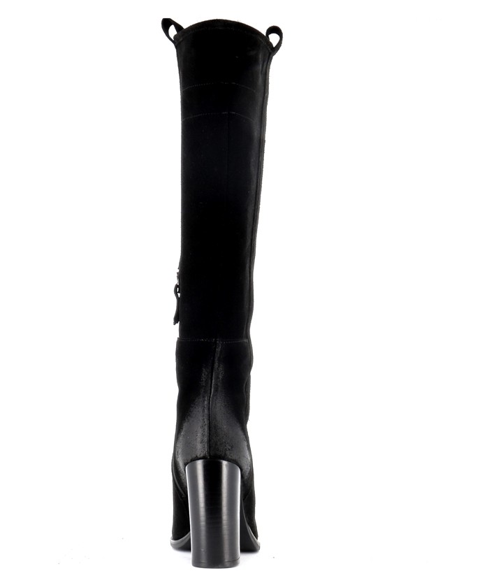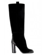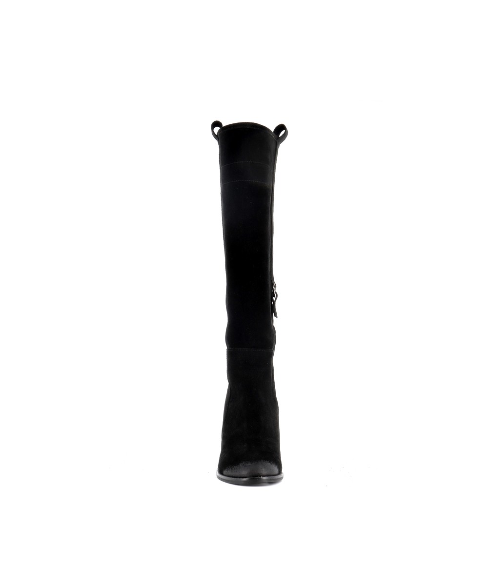 Son design minimaliste est mis en valeur par un daim noir profond et velouté, offrant un rendu noble et raffiné. Sa tige montante structurée épouse harmonieusement la jambe et élance la silhouette. Le talon cylindrique de 10 cm ajoute une touche sophistiquée sans compromettre la stabilité à la marche.