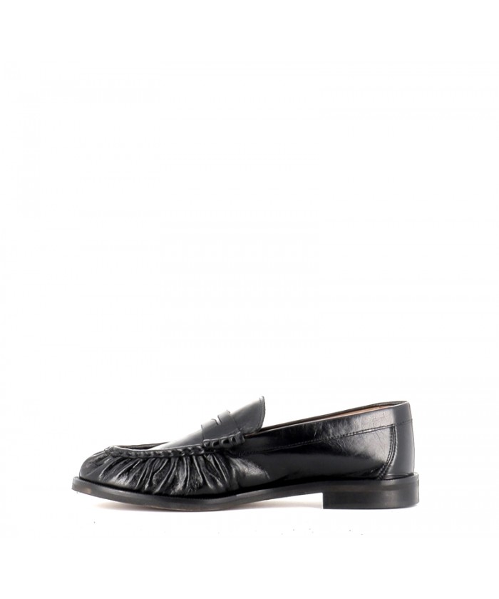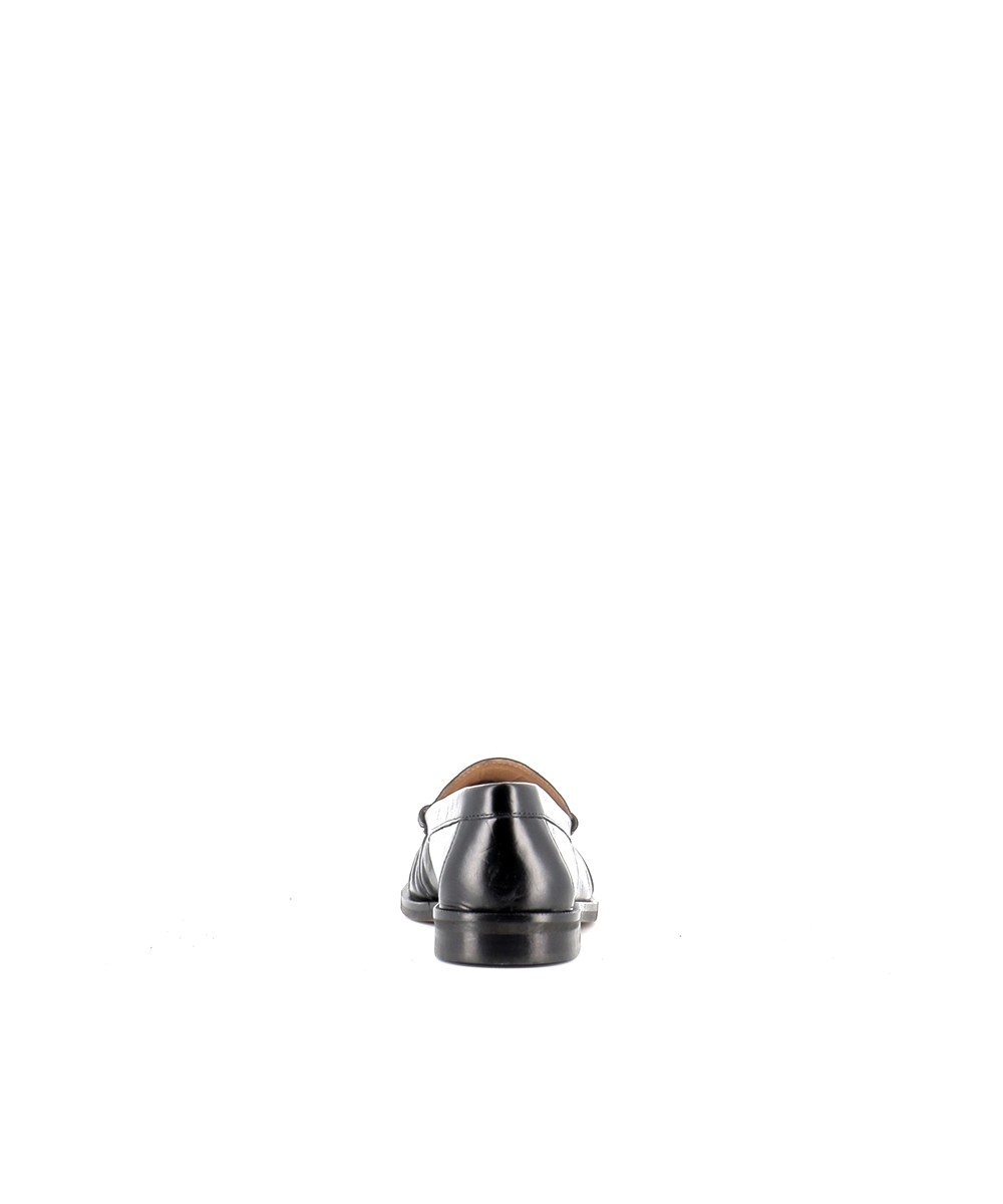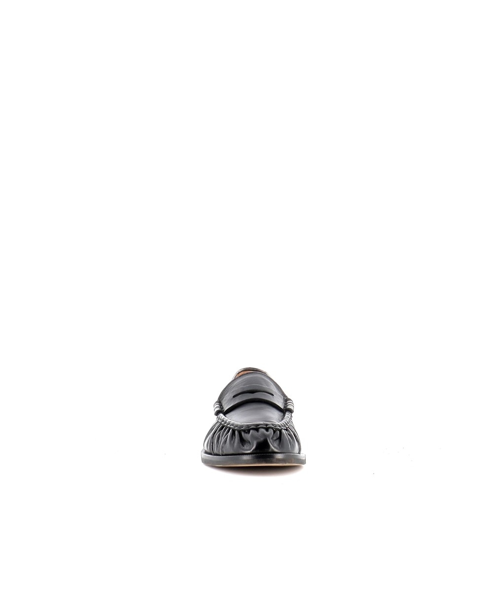 Le cuir noir, à la fois souple et légèrement brillant, apporte une finition élégante et met en valeur les détails du modèle, notamment son effet plissé sur l’avant qui donne du relief et du caractère à la chaussure. Cette signature esthétique modernise le mocassin traditionnel tout en conservant son allure intemporelle.