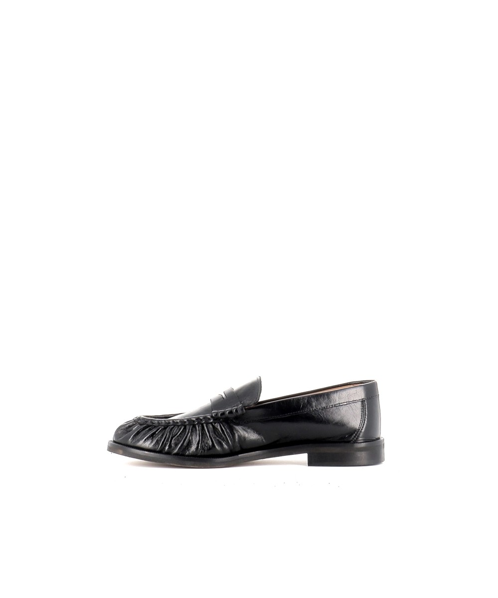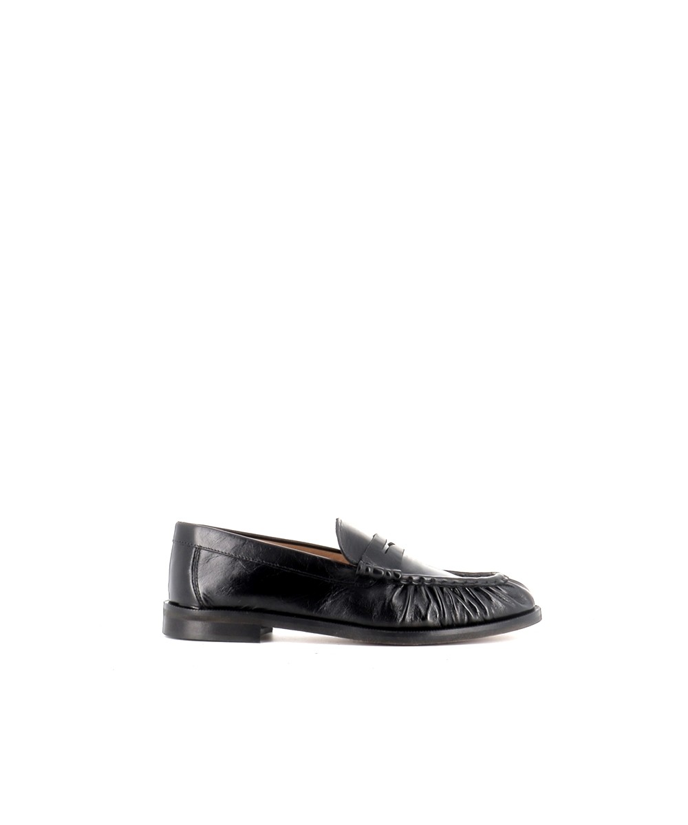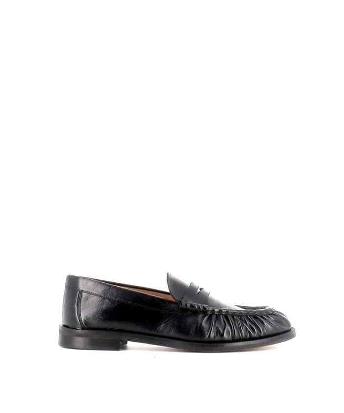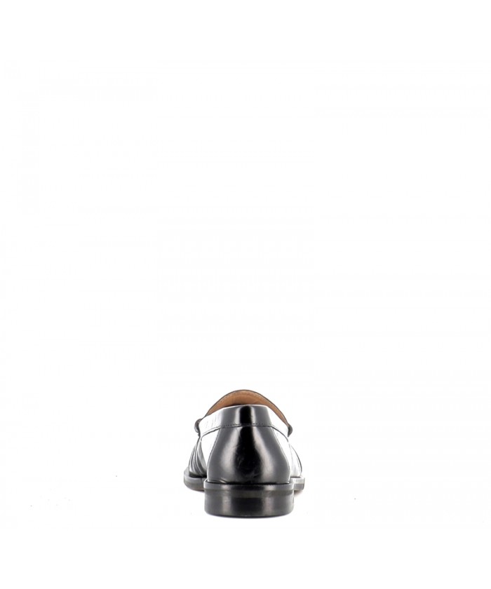 Le cuir noir, à la fois souple et légèrement brillant, apporte une finition élégante et met en valeur les détails du modèle, notamment son effet plissé sur l’avant qui donne du relief et du caractère à la chaussure. Cette signature esthétique modernise le mocassin traditionnel tout en conservant son allure intemporelle.