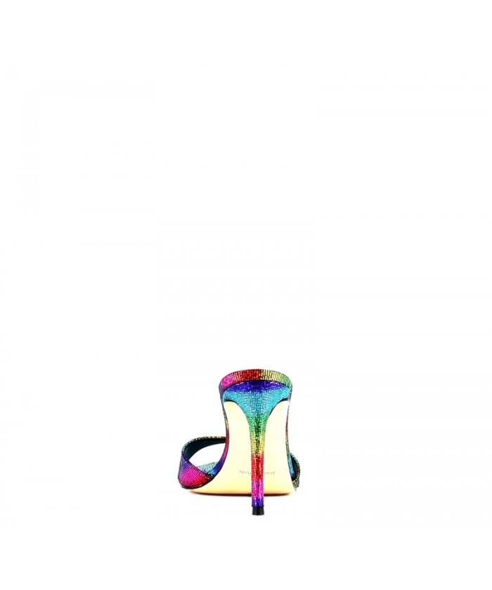 Confectionnée en Italie et signée OSMOSE PARIS, la sandale BEATRICE en satin multicolore effet arc-en-ciel attire immédiatement le regard avec ses reflets lumineux et son style audacieux. Son talon de 10 cm sublime la silhouette avec élégance.