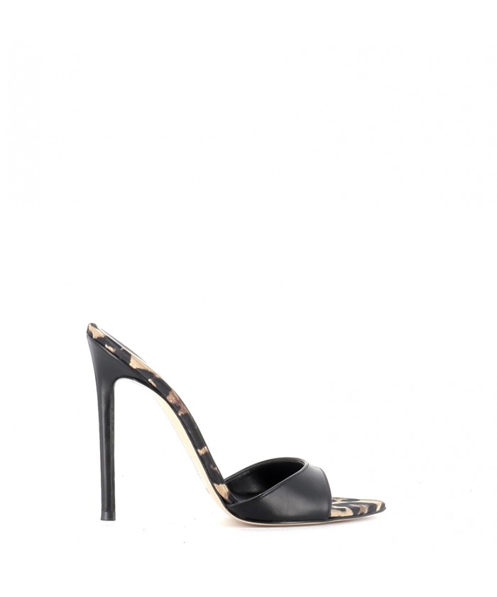 Entièrement conçue en cuir noir, elle se distingue par sa semelle intérieure et extérieure à motif léopard, apportant une touche originale et raffinée sans altérer la sobriété du modèle. Ce contraste subtil permet de rester élégante tout en affirmant une identité mode forte.