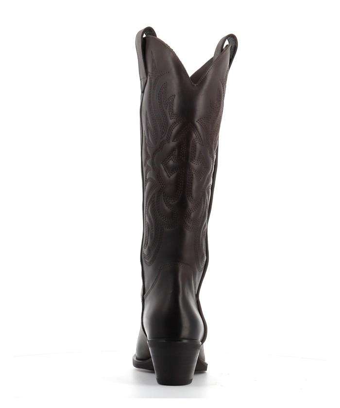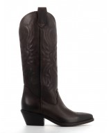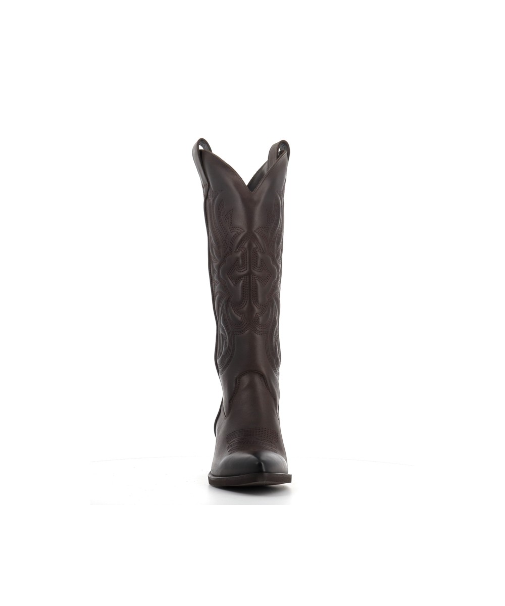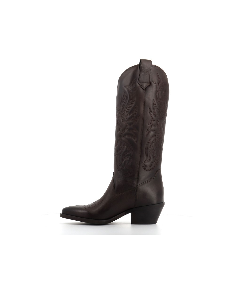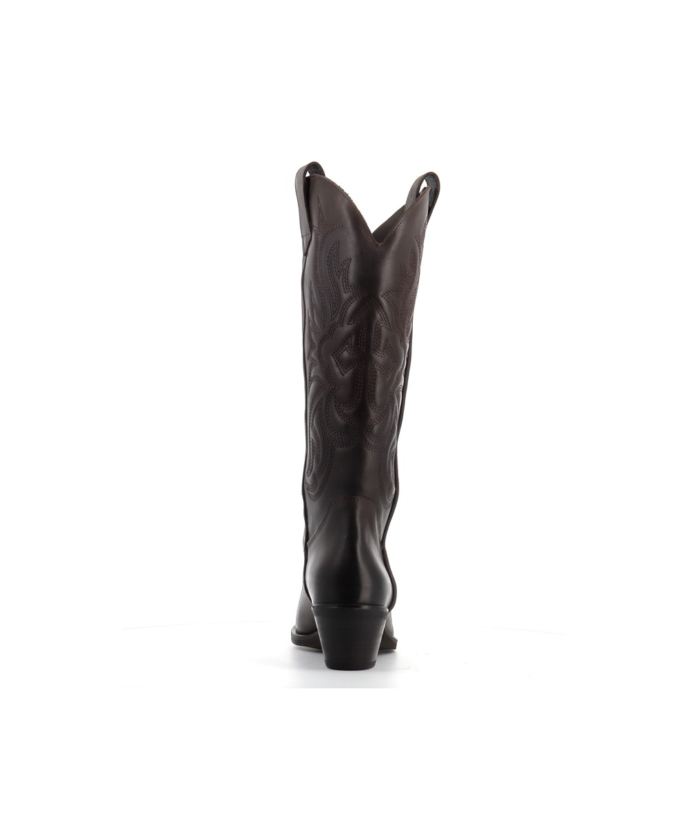 Sa tige haute est rehaussée de broderies emblématiques du style western. Inspirées des motifs traditionnels du Far West, ces arabesques confèrent à la botte une dimension artisanale et expressive. Le bout légèrement pointu, parfaitement équilibré, évoque les silhouettes texanes tout en gardant une modernité facile à porter.
