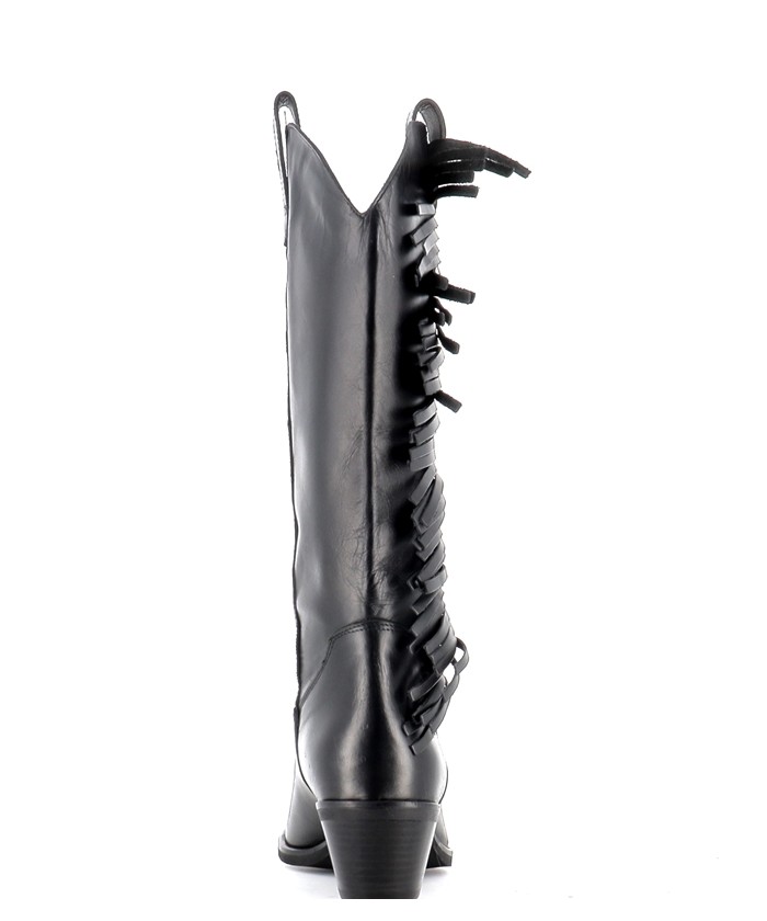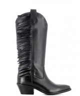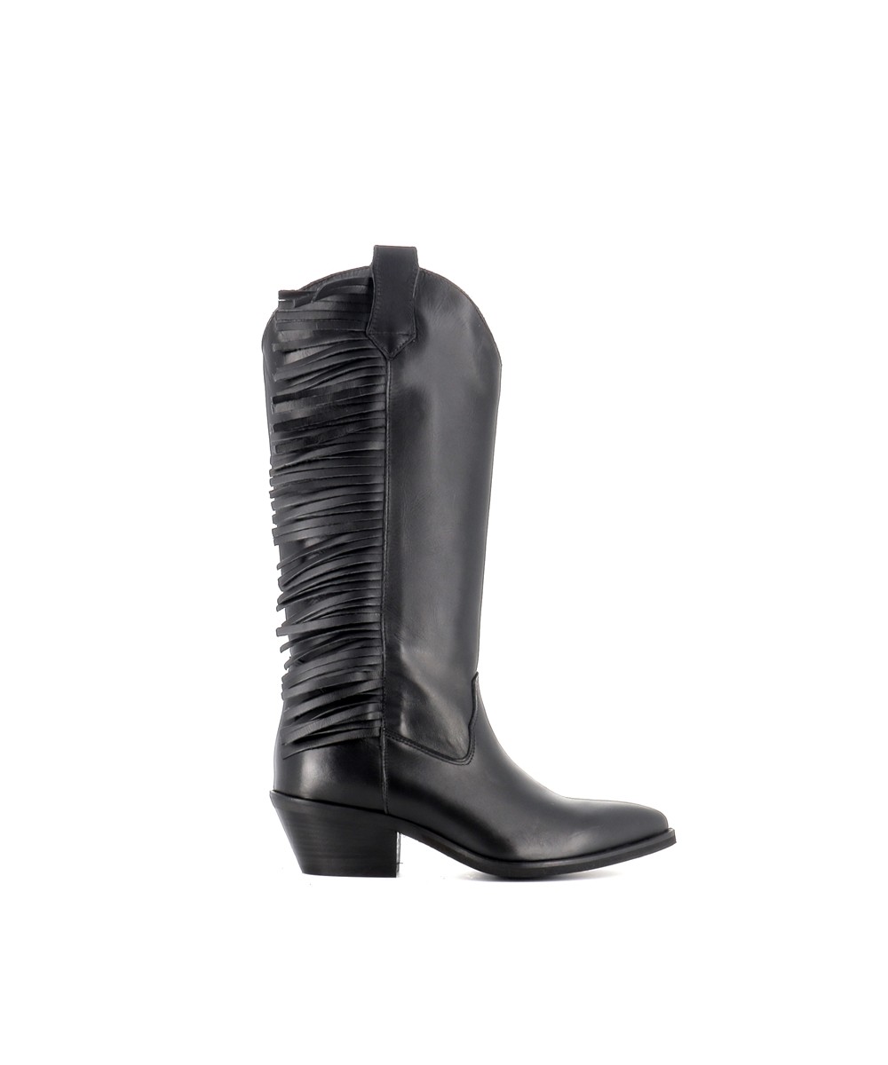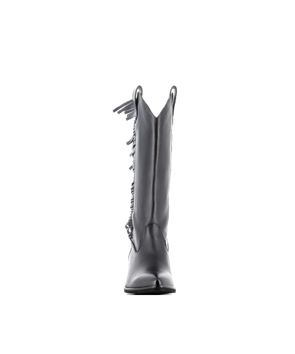 Fabriquée en Italie, cette botte est conçue dans un cuir noir souple et lisse qui épouse le mollet avec justesse. Sa coupe mi-haute (hauteur de tige : 34 cm pour un 38 Europe) est sublimée par un jeu de franges ton sur ton qui apporte du mouvement et un style affirmé à chaque pas. Le bout pointu renforce son allure western, tandis que le talon stable de 5 cm vous garantit une démarche assurée, confortable et élégante, du matin jusqu’au soir.